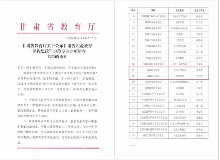 中科低碳新能源技术学院黄述杰负责的“光伏工程技术”和经济管理学院晋艺波负责的“旅游管理”2个专业获评甘肃省职业教育“课程思政”示范专业。