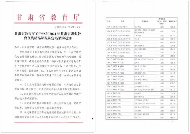 药学院王建强负责的《中药化学》、经济管理学院张海燕负责的《陇原民族民俗》、中科低碳新能源技术学院魏显文负责的《光伏电站运行与维护》、张国祥负责的《智能微电网应用技术》、艺术与教育学院薛媛负责的《美术与幼儿美术创作——手工》、现代农业学院柴贵贤负责的《土壤肥料》、工程技术学院颉栋负责的《焊接工艺与技能训练》、赵特庆负责的《建筑CAD》8门课程获评甘肃职业教育在线精品课程。