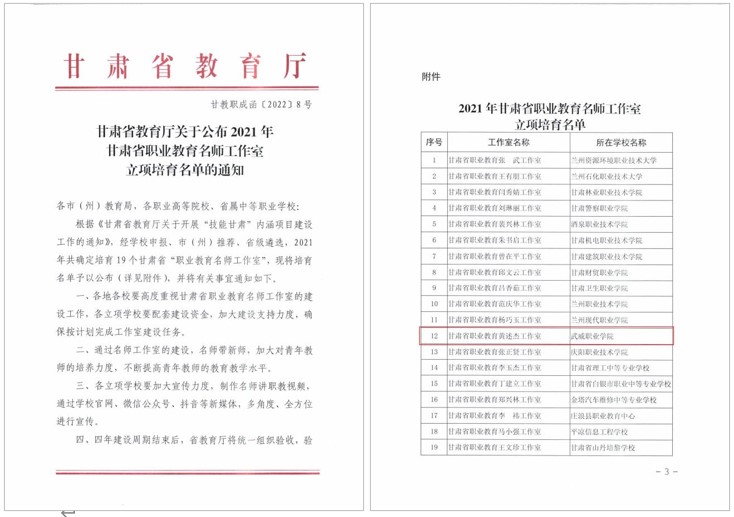 中科低碳新能源技术学院黄述杰负责的“甘肃省职业教育黄述杰工作室”获评甘肃省职业教育名师工作室。