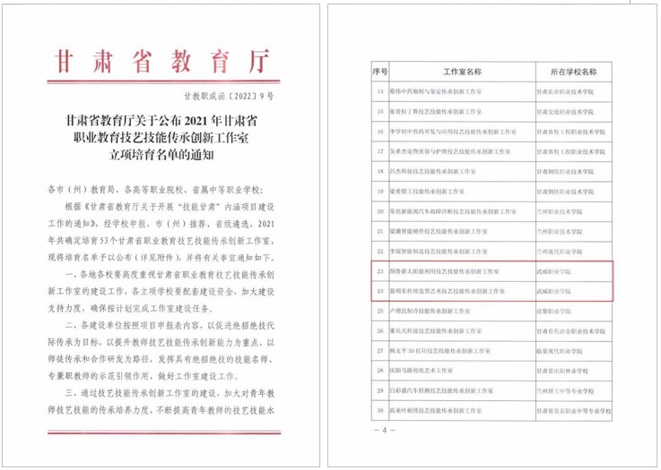 创新创业中心颜鲁薪负责的“颜鲁薪太阳能利用技艺技能传承创新工作室”和艺术与教育学院蓝明东负责的“蓝明东传统造型艺术技艺技能传承创新工作室”获评甘肃省职业教育技艺技能传承创新工作室。