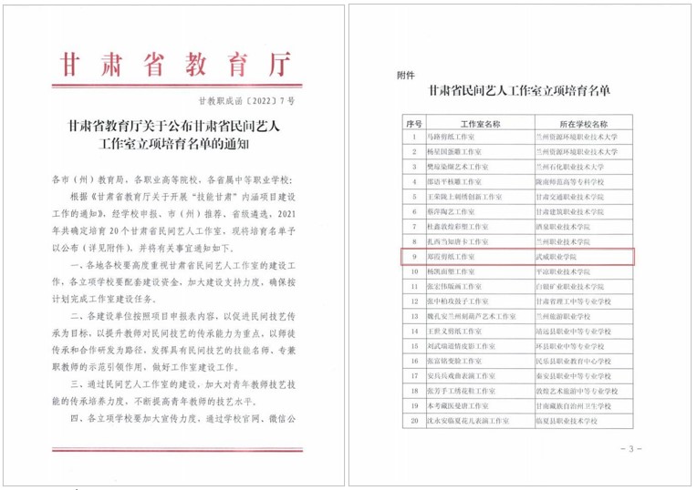 民间艺人、学校非遗技能指导教师郑霞合作申报的“郑霞剪纸工作室”,获评甘肃省民间艺人工作室。