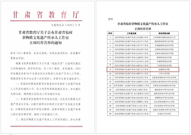国家级非物质文化遗产传承人、学校攻鼓子艺术团指导教师杨门元合作申报的“农村非物质文化遗产传承人杨门元工作室”,获评甘肃省农村非物质文化遗产传承人工作室。
