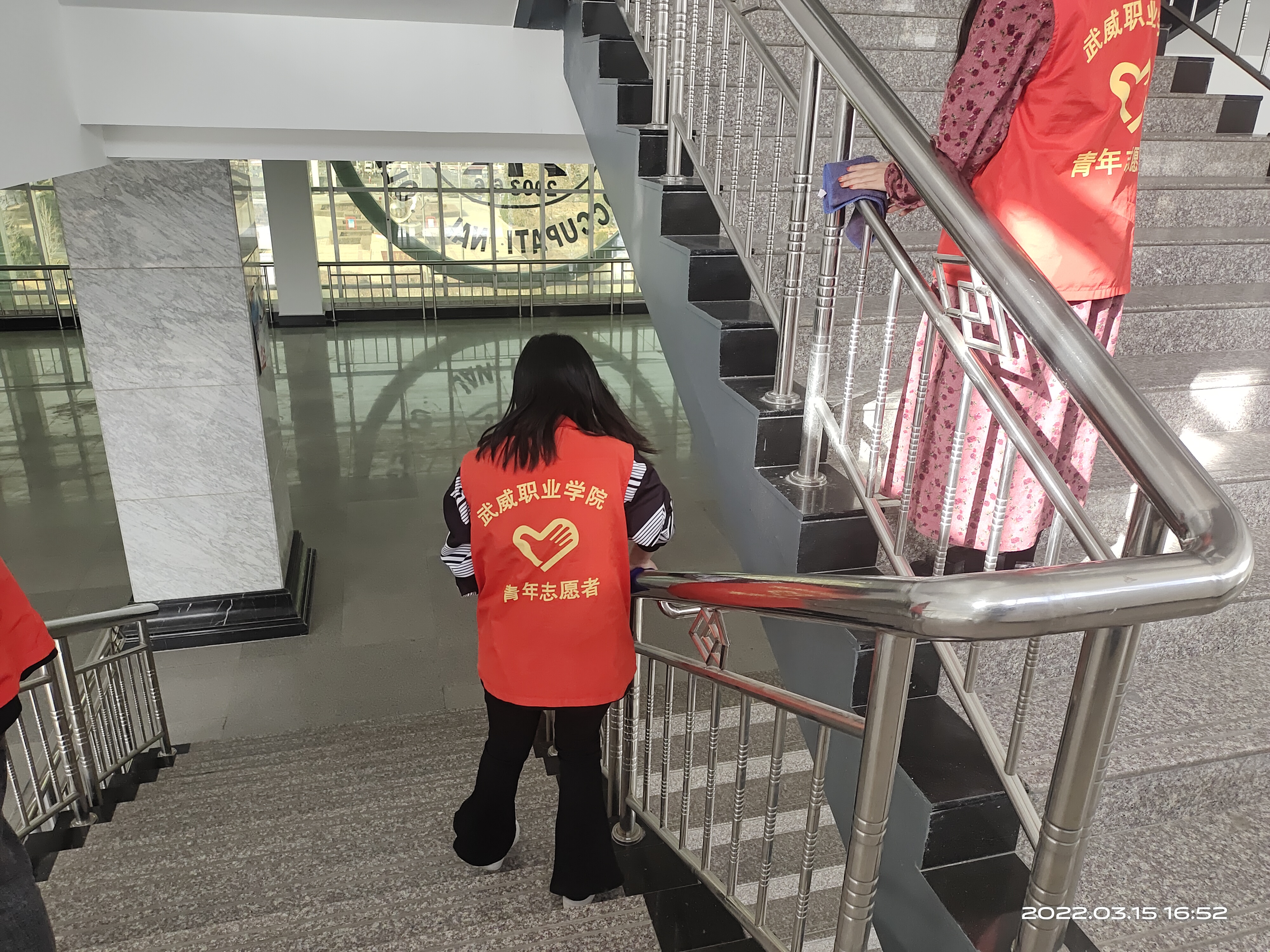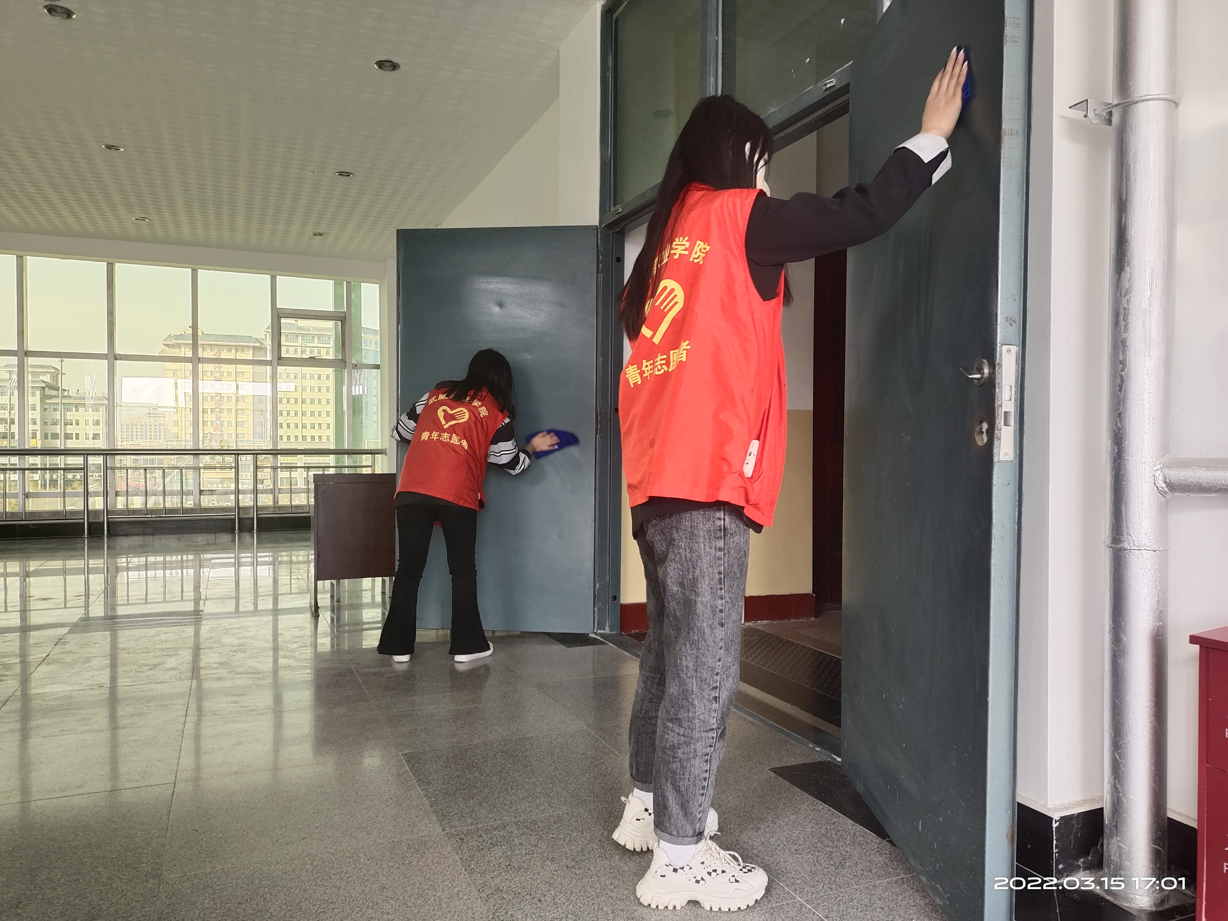 青年志愿者们不仅仅只是一个名义,他们不怕脏,不怕累,穿梭在校园各个角落,他们拿着扫帚、簸箕打扫卫生死角,捡烟头,还有一批在教学楼内打扫公共教室的,有的在收拾垃圾,有的在擦黑板。教学楼门口也有他们的身影,在烈日炎炎下擦拭着玻璃,他们这种勇于参与志愿者活动、不怕苦、不怕累的精神值得同学们学习。