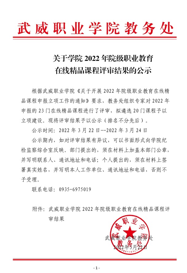 关于学院2022年院级职业教育在线精品课程评审结果的公示