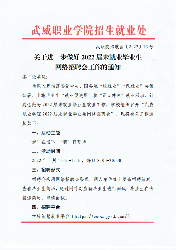 武威职业学院2022届未就业毕业生就业促进周暨网络招聘会邀请函