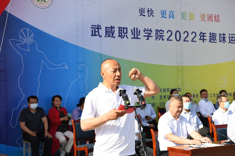 裁判员代表叶祥伟和运动员代表杨春芳分别代表裁判员和运动员进行宣誓。随后,赵明宣布“武威职业学院2022年趣味运动会开幕”!全场响起热烈的掌声。