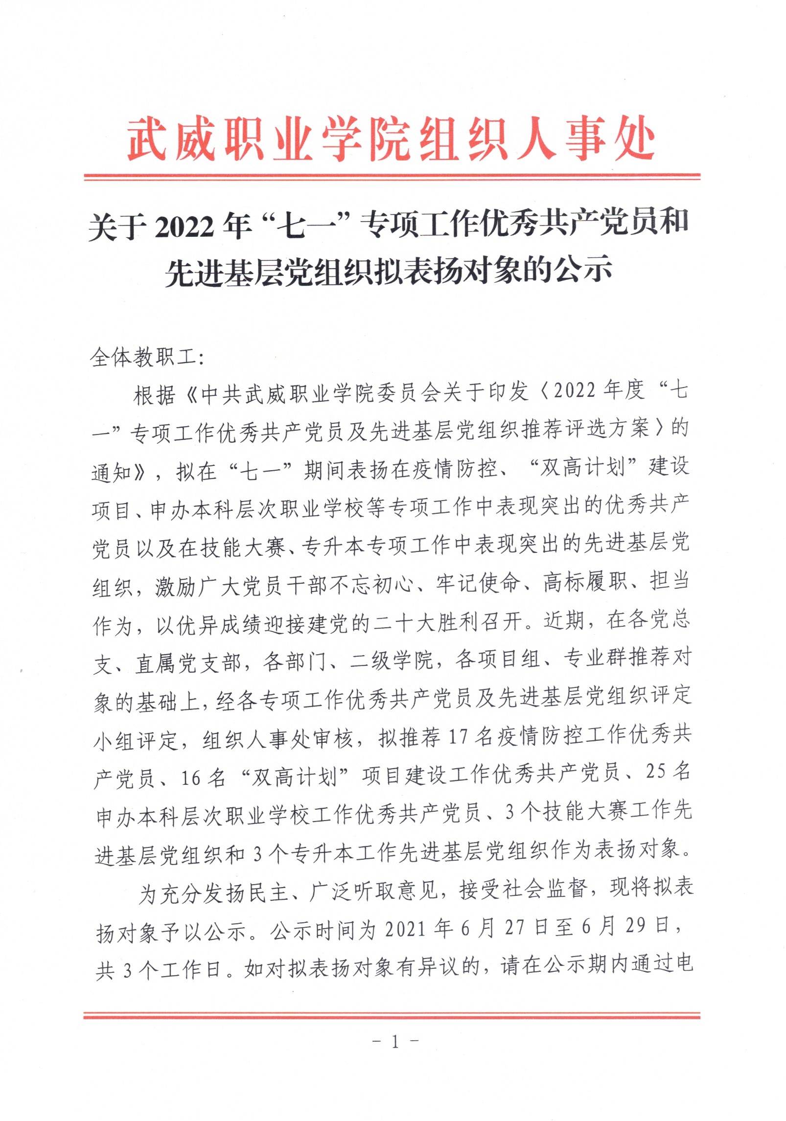 关于2022年“七一”专项工作优秀共产党员和先进基层党组织拟表扬对象的公示