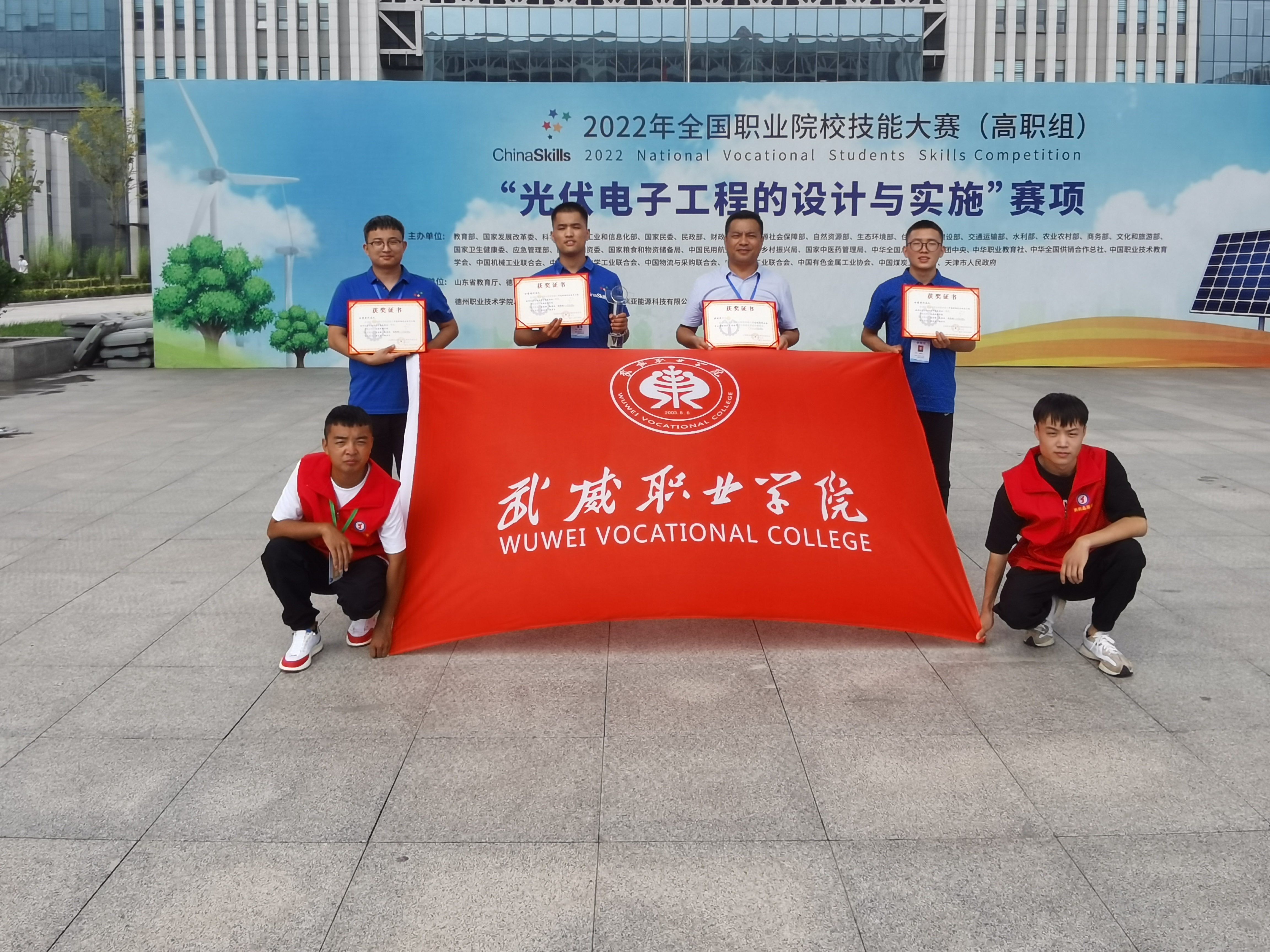 8月22日至23日,由教育部、工业和信息化部、财政部、人力资源和社会保障部、住房和城乡建设部、交通运输部、农业部等部委主办的2022年全国职业院校技能大赛高职组“光伏电子工程的设计与实施”赛项在山东德州职业技术学院举办,来自全国30个省(市)、自治区的55支代表队参加了比赛。武威职业学院中科低碳新能源技术学院高东兴、富金强、赵宝林三名同学代表甘肃省参加本次大赛,最终荣获国赛一等奖,完全实现了赛前确定的“稳二争一”的目标任务。这是学校参加全国职业院校技能大赛以来首次获得国赛一等奖,实现了学校该赛项国奖“零”的突破,开启了学校专业建设高质量发展新征程。本次优异成绩的取得充分展现了学校“岗课赛证”相融通的综合育人效果,充分体现了学校深化“三教改革”推动高质量发展的成效,充分彰显了学校实施“双高计划”“技能甘肃”“提质培优”等重大项目建设推进高水平发展的成效,本次竞赛成绩是对学校新能源类专业建设的肯定,也是武威乃至全省职业教育发展的试金石和荣光。