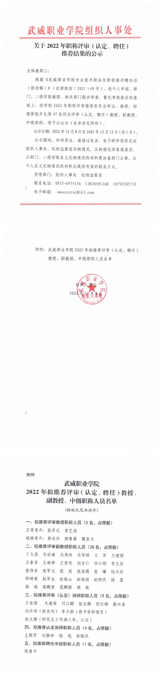 武威职业学院关于2022年教师副教授、讲师职称评审结果的公示