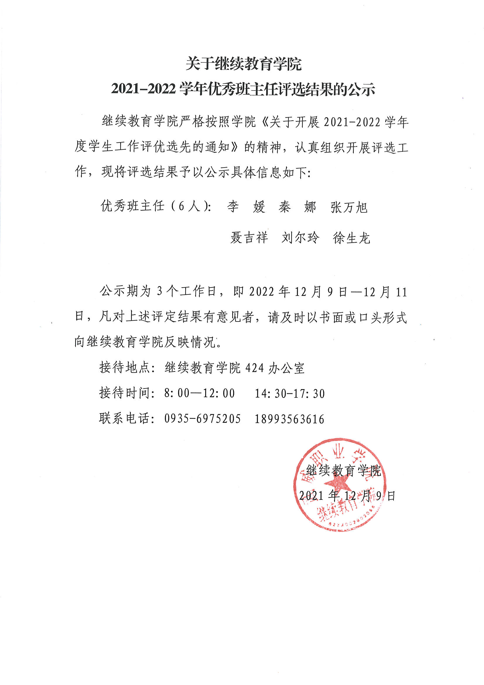 继续教育学院关于2021-2022学年优秀班主任评选结果的公示