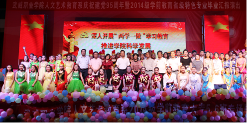 6月30日,在喜迎党的95华诞之际,恰逢人文艺术教育系2014级学前教育专业学生毕业汇演。同学们用自己的学习成果向党的生日献礼。学院院长宗瑞谦教授,党委副书记赵明教授、副院长翟存祥教授、副院长潘玉华副教授到场观看了演出。