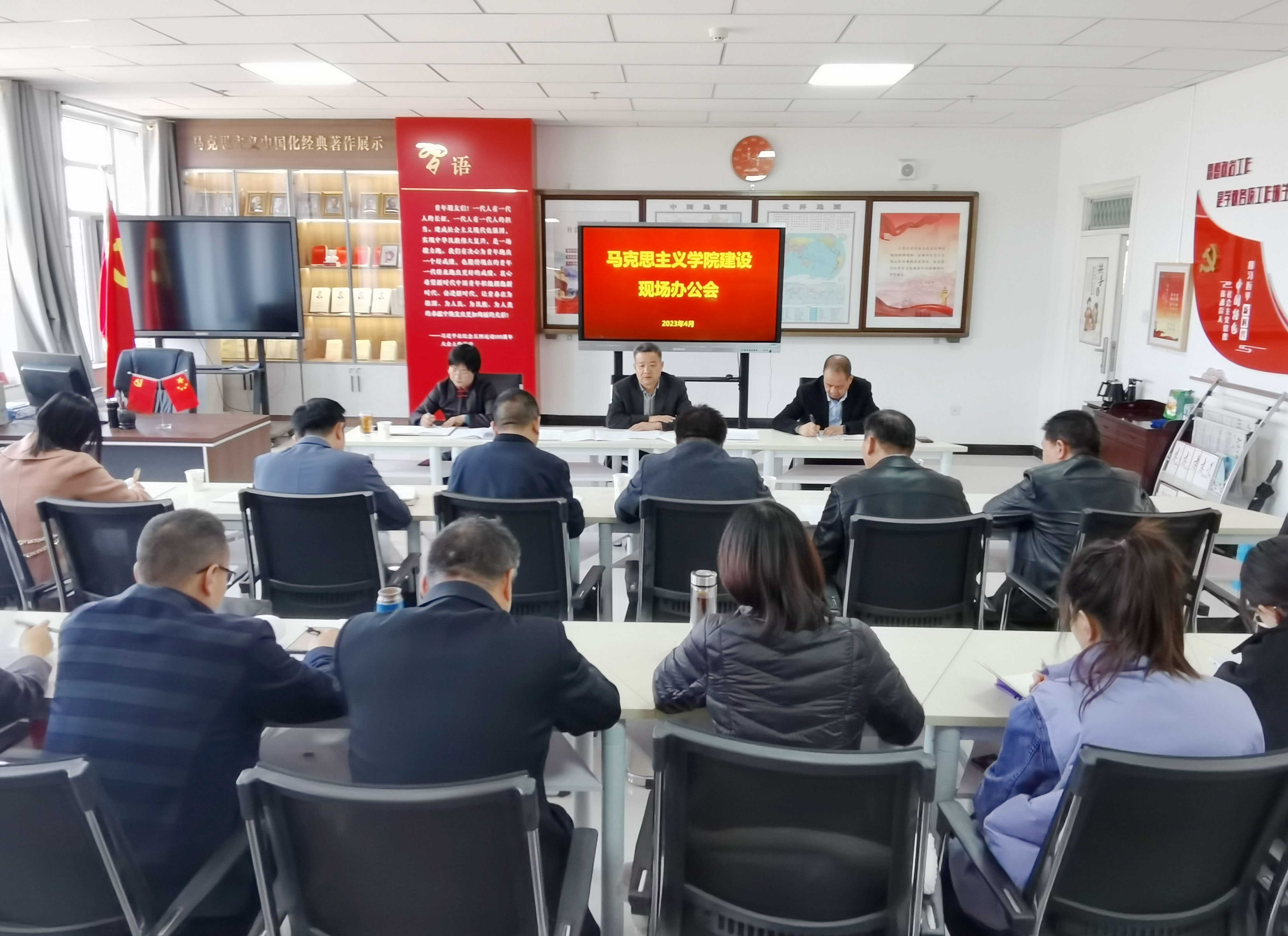 4月6日,学校党委书记、校长赵明到马克思主义学院召开现场办公会,会议在翟存祥思想政治理论课名师工作室举行。党委副书记翟存祥,党委委员、副校长何毅出席会议,组织人事处、宣传统战部、教务处、国有资产管理处、计划财务处主要负责人,马克思主义学院全体教师参加会议。会议由党委副书记翟存祥主持。