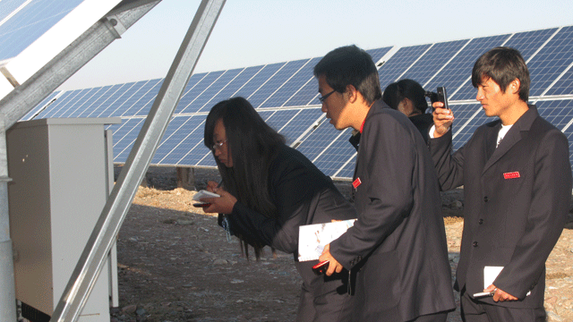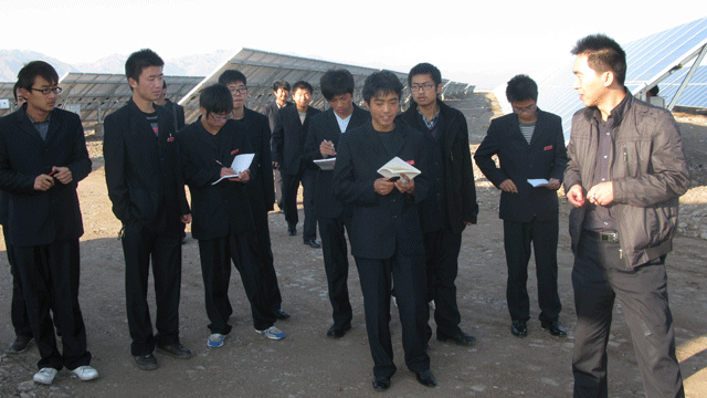 在观摩学习过程中,全体师生受到了园区管委会工作人员的热情接待,管委会张国伟主任带领师生参观了中节能甘肃武威太阳能发电有限公司,公司负责人向大家介绍了园区建设情况,从多晶硅、单晶硅的提炼、太阳能电池板的生产制造到光伏电站的建设,对光伏发电产业链进行了较详尽的讲述。同学们看到园区内一排排整齐摆置的太阳能电池板方阵时,都流露出激动崇敬的神情,一个个边走边看,并伸手触摸太阳能电池板。同学们就光伏发电的原理、电池使用寿命、光电转换效率以及光伏电站的运行维护等方面的专业知识向负责人请教,面对大家的疑问,园区负责人都耐心细致的做了解答。
