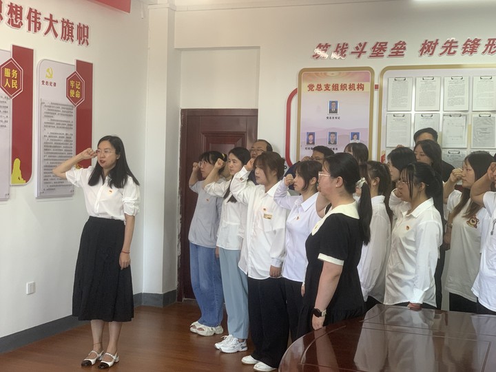 教师党员赵文杰带领全体预备党员进行入党宣誓,全体老党员重温入党誓词。党员们集体面向党旗,举起右拳,跟随领誓人宣誓,郑重许下对党的承诺,表达着自己为共产主义事业奋斗终身的决心。每位党员都接受了一次深刻的思想洗礼,更加明确了新时代党员的责任担当。