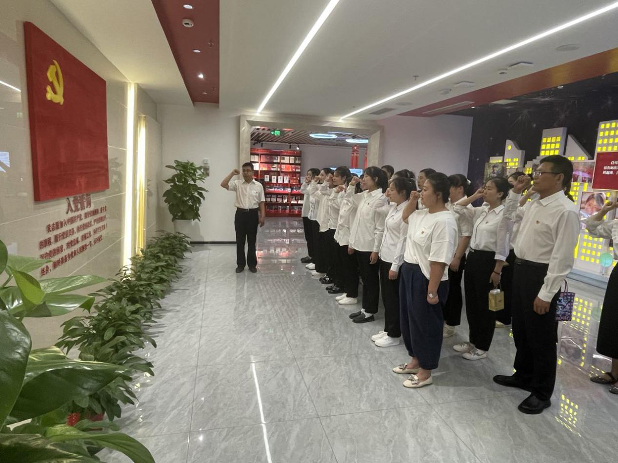 在鲜红的党旗下,大家高举右拳,新发展党员入党宣誓,老党员重温入党誓词。