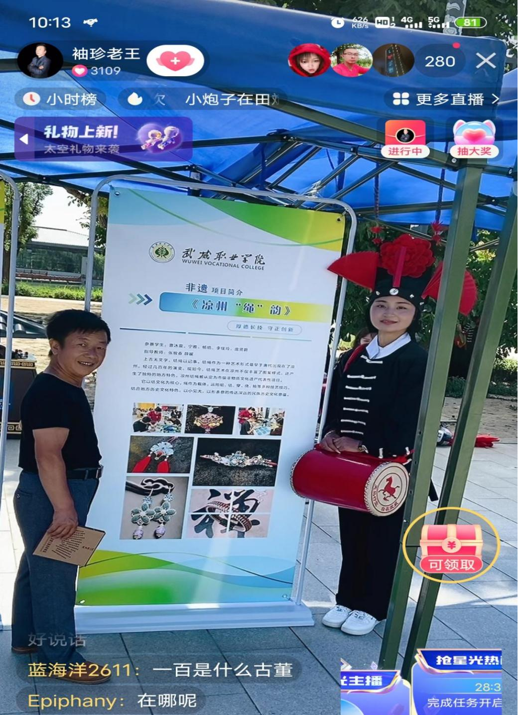 为深入学习贯彻习近平新时代中国特色社会主义思想和党的二十大精神,引导和帮助广大青年学生上好与现实结合的“大思政课”,厚植爱农情怀,练就过硬本领。暑假期间,经济管理学院组建了“特色高效农业电商直播+非遗传承”乡村振兴促进团,开展暑期“三下乡”社会实践活动,通过深入雷台景区、古浪县和民勤县,宣传国家级非物质文化遗产,结合抖音直播与新媒体宣扬非遗文化-凉州攻鼓子,为非遗传承注入青春力量。