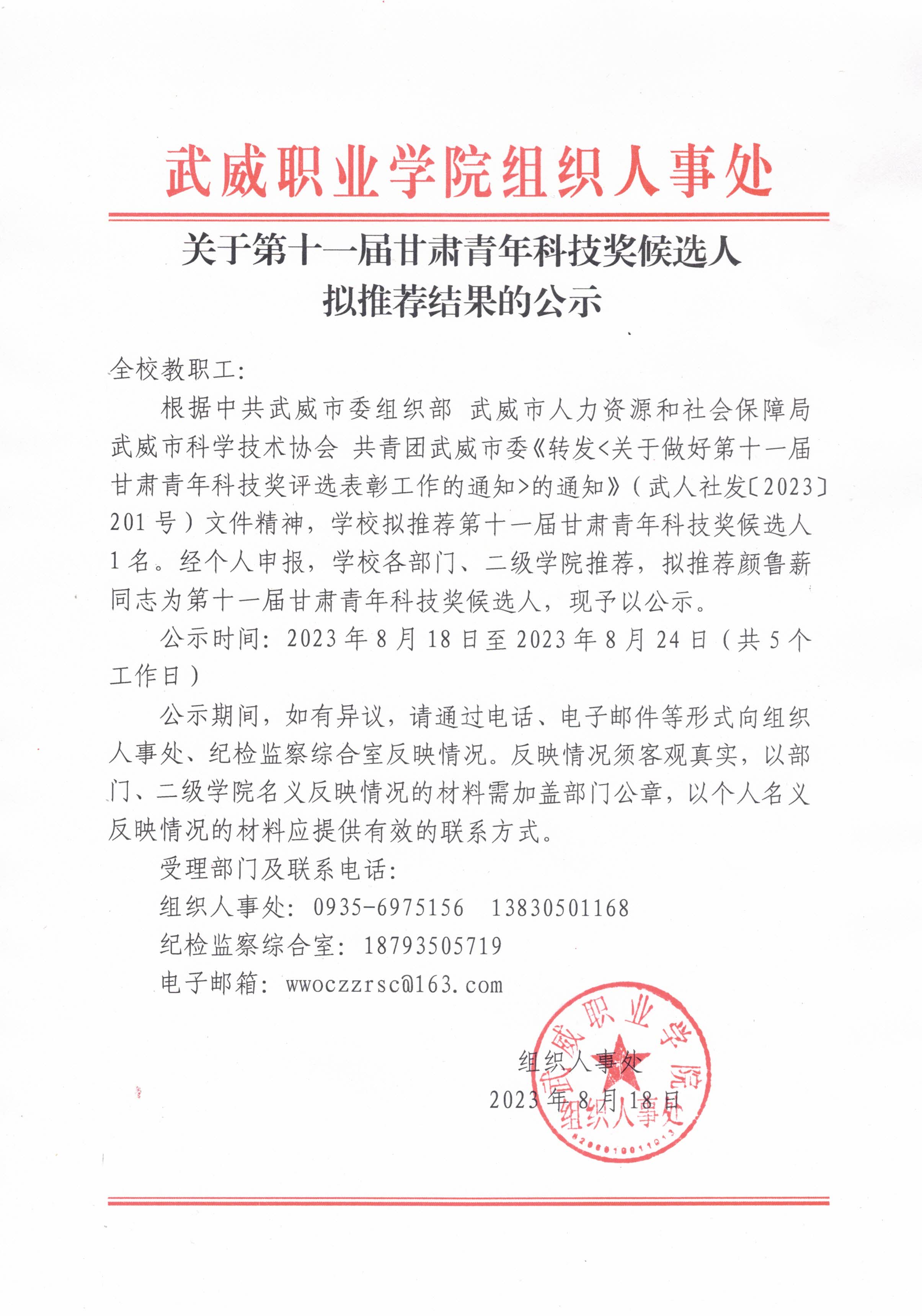 关于第十一届甘肃青年科技奖候选人拟推荐结果的公示