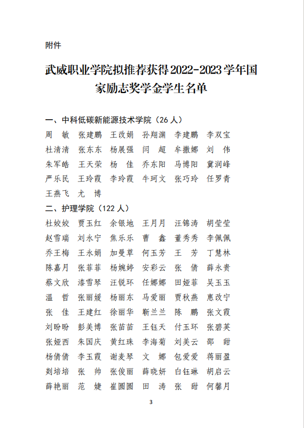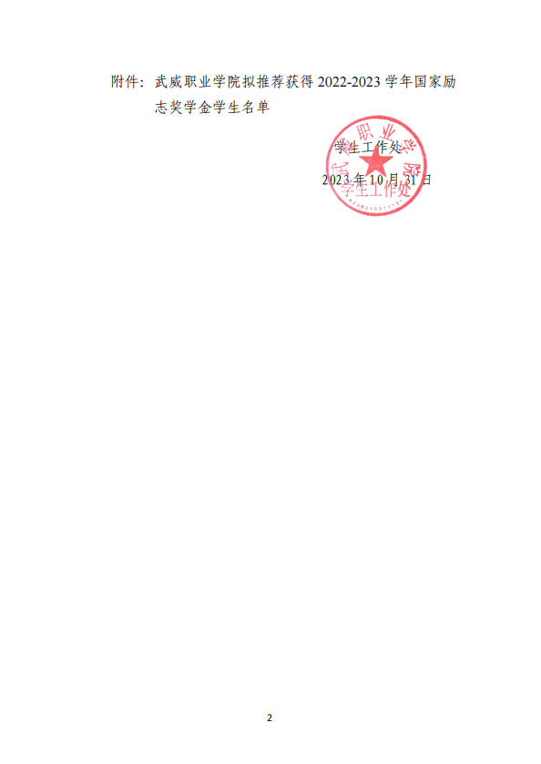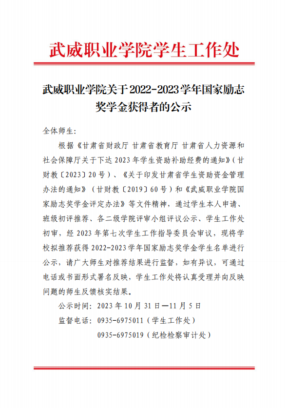 武威职业学院关于2022-2023学年国家励志奖学金候选人的公示
