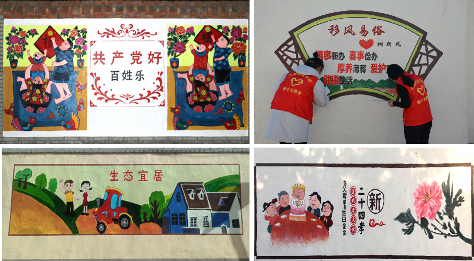 自2019 年以来,武威职业学院坚持“立足地方、融入地方、服务地方”的发展理念,将优势学科专业与武威市经济社会发展紧密结合,组织师生开展“打造人文美居助力乡村振兴”墙体彩绘志愿服务项目,通过墙体彩绘反映党的领导下农村精神风貌的变化和取得的成就,将村庄重点街巷屋面墙体绘制出一幅幅反映美丽乡村建设、社会主义核心价值观、移风易俗、乡风文明等为主题的墙体画,形象生动、 通俗易懂的内容让村民变“被动学”为“主动看”,不仅展现了农村新生活、农业新气象、农民新面貌,美化了村容村貌,为美丽乡村建设、人居环境美化添砖加瓦。