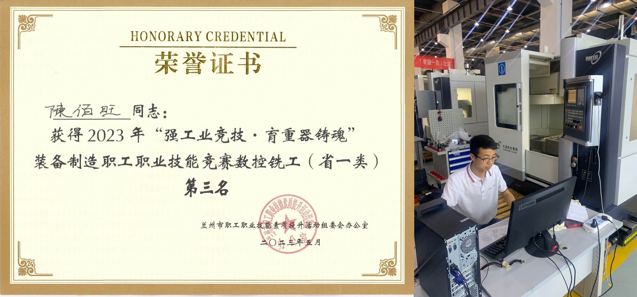 为深入学习贯彻党的二十大精神,聚焦实施强工业、强科技、强省会、强县城“四强行动”,着力打造高技能人才队伍,2023年6月,由甘肃省总工会主办,兰州市总工会和兰石集团承办的2023年全省职工职业技能竞赛“数控铣”赛项省级一类决赛在兰州新区举办,来自全省22个企事业单位46名职工选手参赛。工会联合工程技术学院积极组队参赛,代表武威市参加了本次比赛。经过三天的竞技角逐,我校教师陈佰旺取得二等奖(第三名)的优异成绩,获得了“甘肃省技术能手”和“甘肃省技术标兵”荣誉称号。
