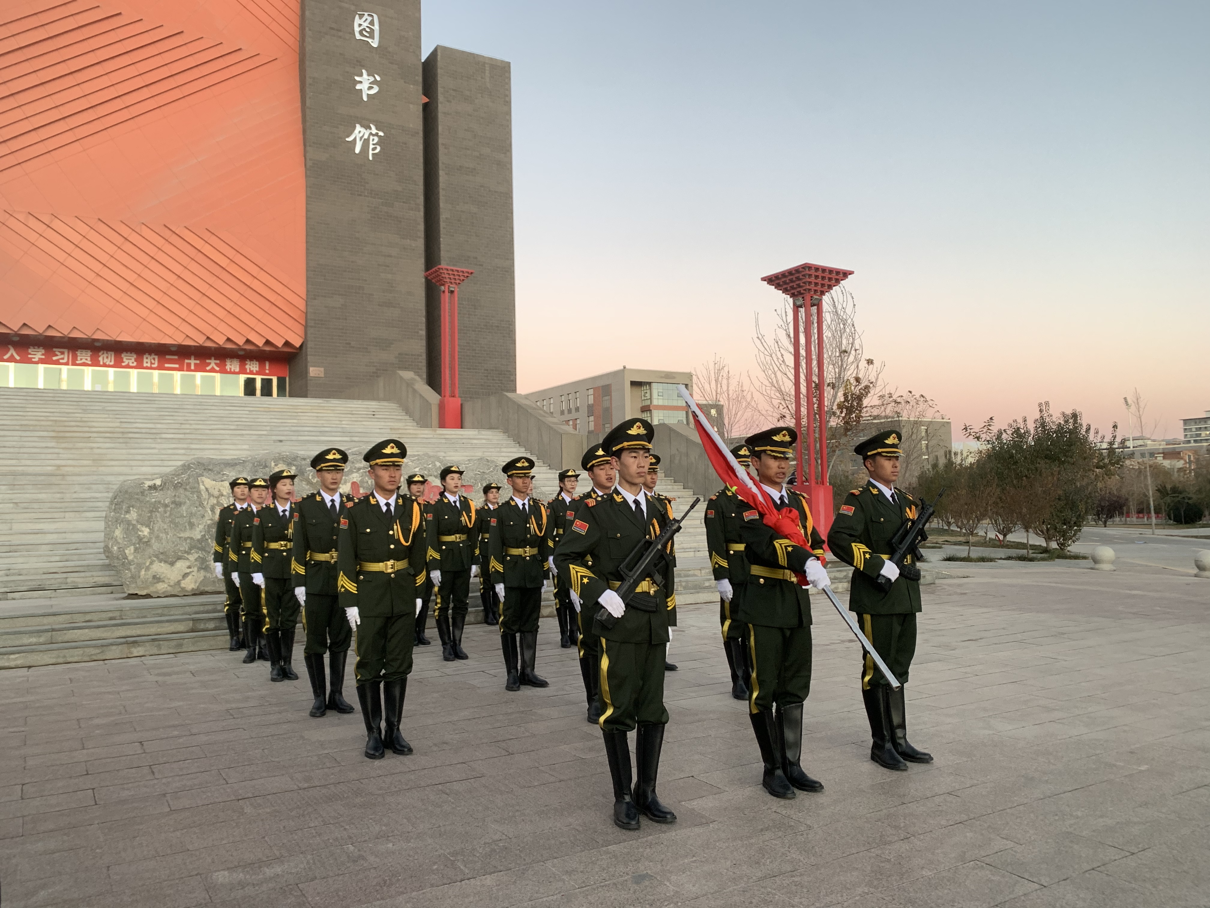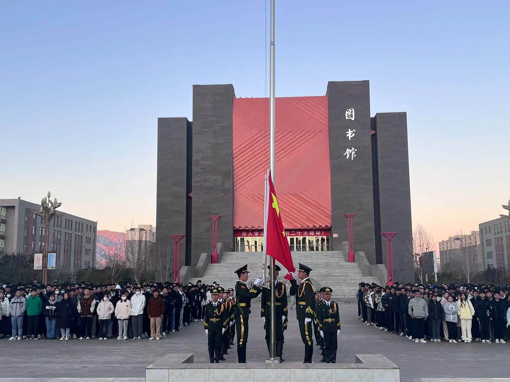 国旗护卫队迈着整齐划一的步伐,在铿锵有力的脚步声中护卫着五星红旗入场。伴着庄严嘹亮的国歌声,旗手振臂一挥,鲜艳的五星红旗徐徐展开。在师生的庄严注视中,五星红旗缓缓升起,在熠熠晨光中迎风飘扬。