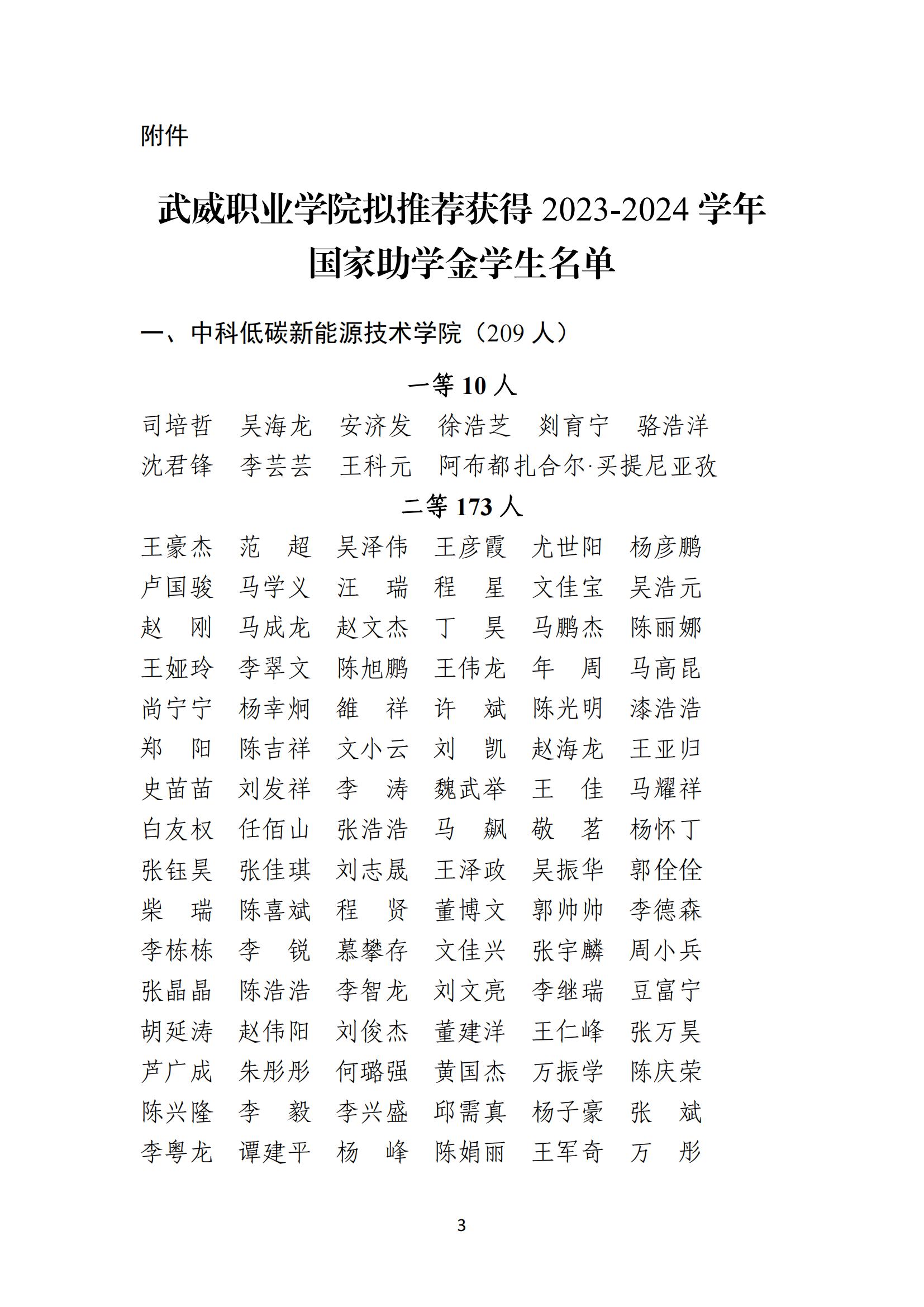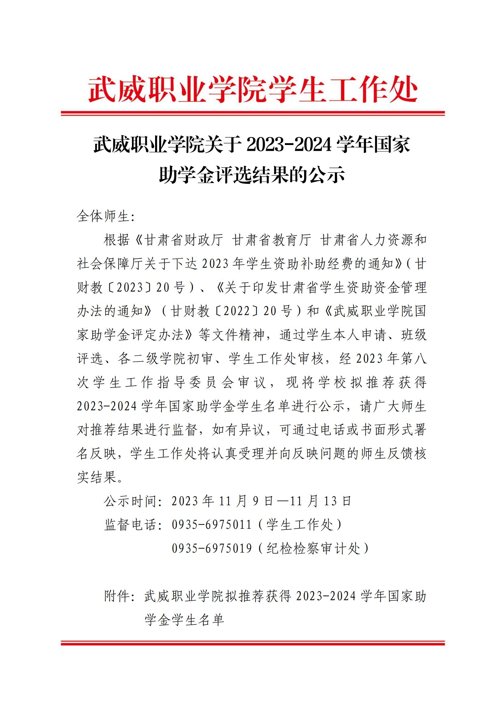 武威职业学院关于2023-2024学年国家助学金评选结果的公示