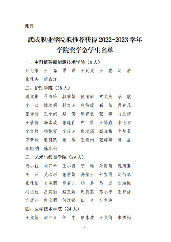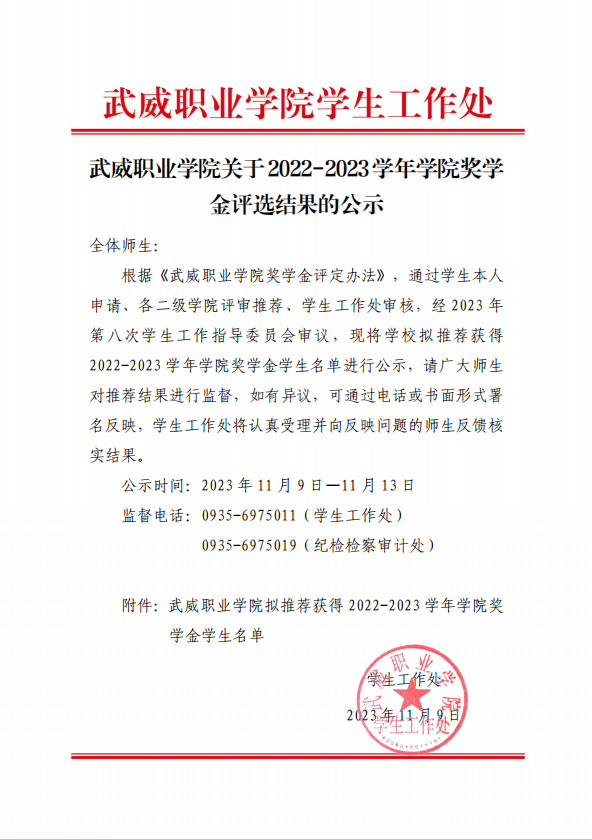 武威职业学院关于2022-2023学年学院奖学金评选结果的公示
