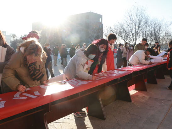 防艾知识宣传志愿队伍在大学生活动中心广场发放宣传手册,制作并赠送红丝带标志400余个,活动中对300余名学生进行了免费艾滋病检测。同学们一同在宣传条幅上签名,祝福语书满了红丝带,一撇一捺、一笔一划,都是无数的信念与期望的汇聚,是大家用无声的行动承诺自己防艾的决心。
