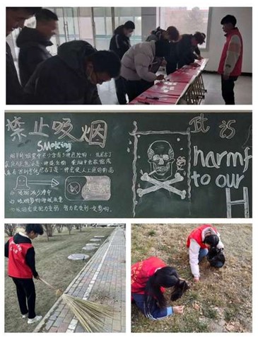 活动中,我院师生通过捡拾烟头、绘制黑板报等形式,向师生们宣传吸烟的危害以及创建无烟校园的意义。