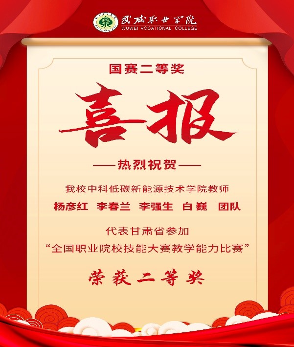 近日,2023年全国职业院校技能大赛教学能力比赛决赛在江西现代职业技术学院落下帷幕,由中科低碳新能源学院教师杨彦红、李春兰、李强生、白巍组成的参赛团队作为甘肃省唯一一支打入国赛决赛的团队,代表甘肃省参加比赛,喜获专业课程高职一组二等奖。