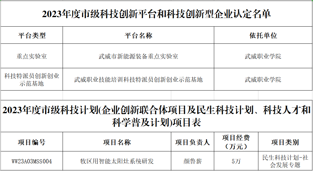 学校喜获武威市新能源装备重点实验室、科技特派员创新创业示范基地