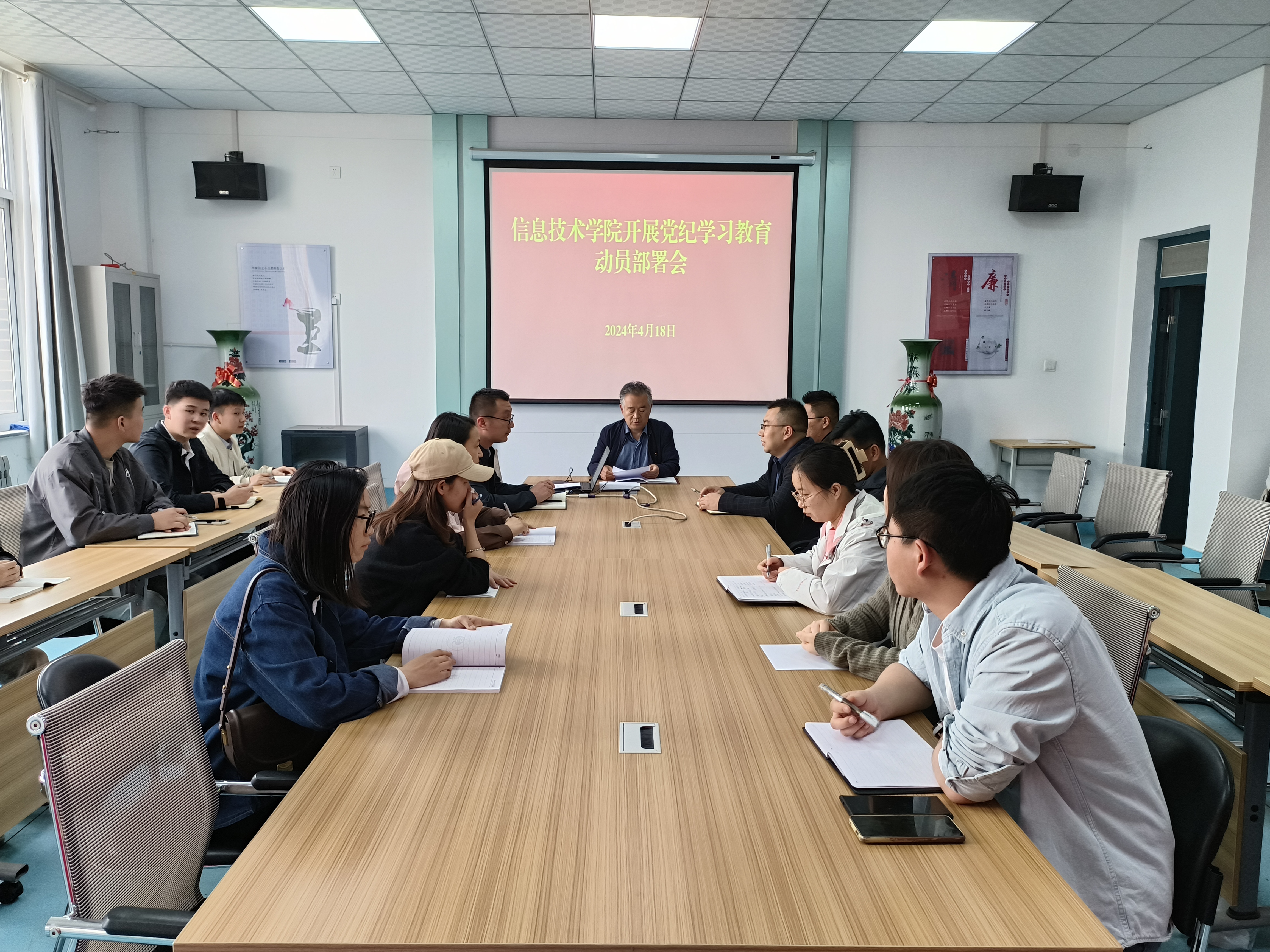4月18日,信息技术学院召开党纪学习教育动员部署会议,传达学习中央、全省和学校开展党纪学习教育动员部署会有关精神。根据《武威职业学院开展党纪学习教育工作方案》的通知要求,安排部署学院党纪学习教育工作。学院党总支书记潘从明主持会议并作动员讲话,全体党员参加会议。