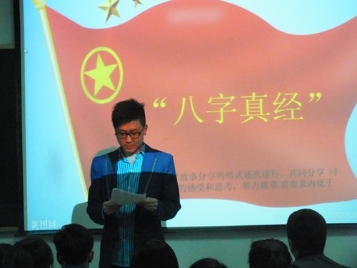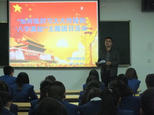 主题团会上,系学生会干部和系团干部以及各班学生代分别就习总书记的“八字真经”的精神通过讲故事,说道理等形式进行了表达,活动气氛热烈,大家踊跃发言,从生活、学习各个方面的小事说起,就“八字真经”的内涵进行了深入的剖析。