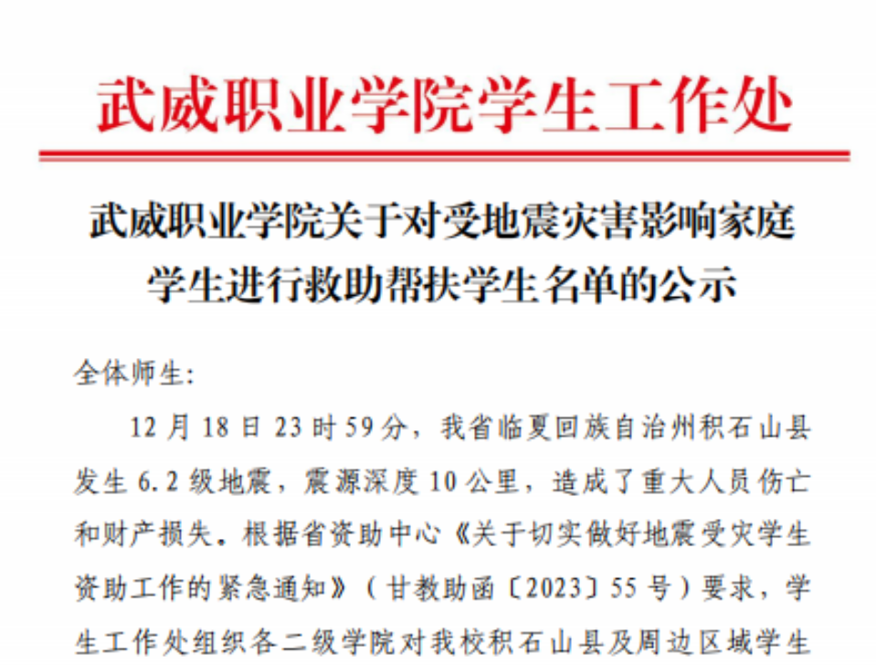 12月18日23时59分,我省临夏回族自治州积石山县发生6.2级地震。地震发生后,学校高度重视灾区学生家庭受灾情况,密切关注各项灾情的发展变化,第一时间对积石山县及周边区域地震受灾家庭学生情况进行摸排,迅速启动救助帮扶关爱工作。