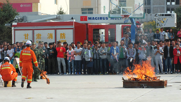 在演练现场,武威消防支队的工作人员详细讲解了我院配备的ABC型干粉灭火器的性能、用途、操作方法及扑救初起火灾的注意事项,并进行了现场演示。2015级各新生代表组成灭火队依照次序和规定,进行了模拟火灾的现场扑救演练。演练中,灭火队员动作正确、快捷、灭火过程快速安全,观摩的同学们也很认真。