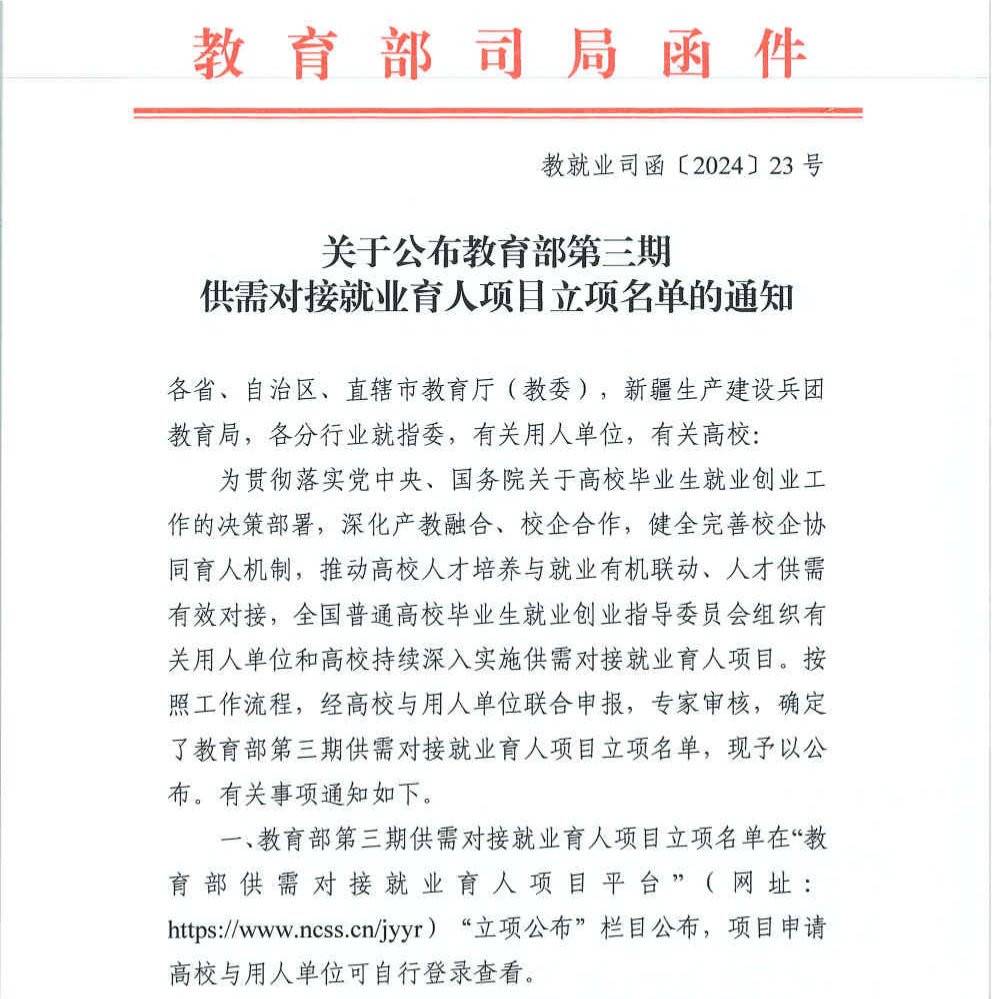 近日,教育部高校学生司下发《关于公布第三期供需对接就业育人项目立项名单的通知》,学校6个供需对接就业育人项目被批准立项,其中就业实习基地项目2个、人力资源提升项目1个、定向人才培养项目2个,重点领域校企合作项目1个。