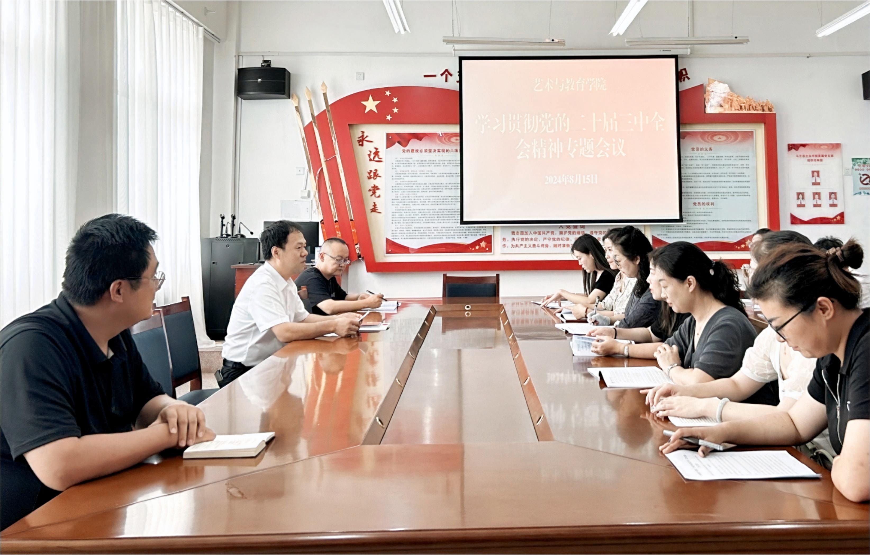 8月15日,艺术与教育学院召开党的二十届三中全会精神专题学习会议,传达学习《习近平总书记关于<中共中央关于进一步全面深化改革、推进中国式现代化的决定>的说明》《中国共产党第二十届中央委员会第三次全体会议公报》《中共中央关于进一步全面深化改革推进中国式现代化的决定》,以及《深化教育综合改革》等内容。会议由学院党总支书记王政主持,全体教职工参加会议。