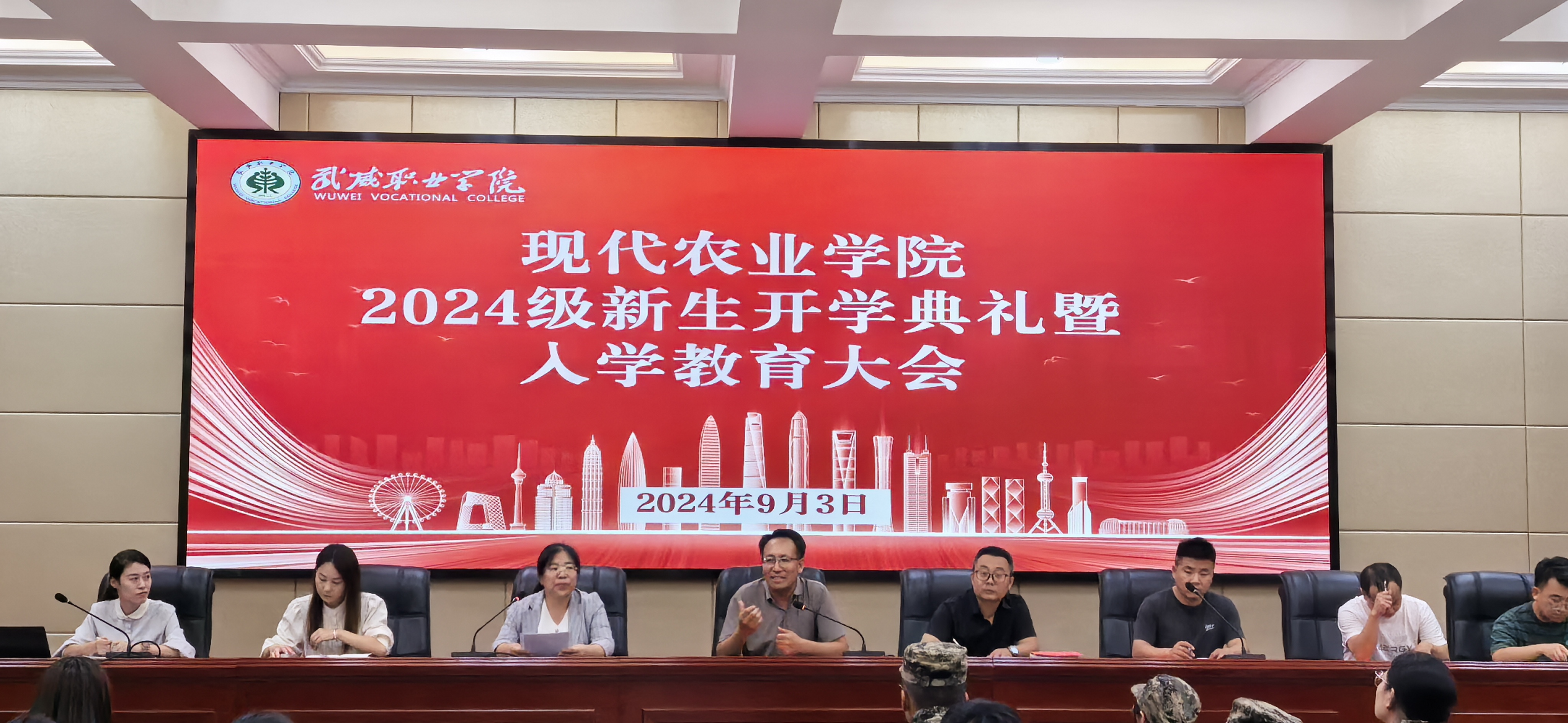 2024年9月3日,现代农业学院在行树楼北侧报告厅举行了2024级新生开学典礼暨入学教育大会。现代农业学院党总支书记申宾德、副院长王增丽、蔡海、各教研室主任、辅导员、各新生班班主任及139名新生参加了此次见面会。