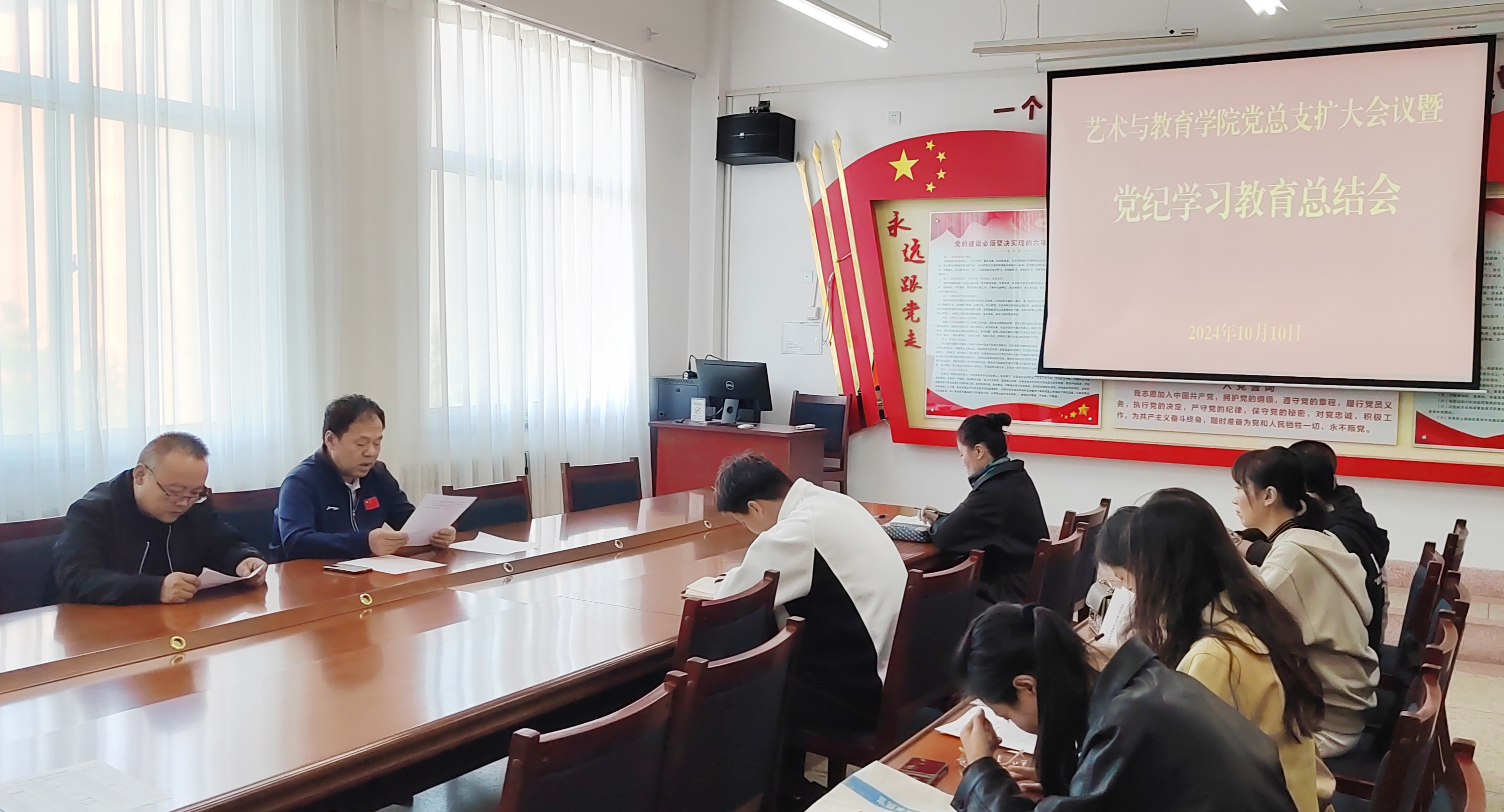10月10日下午,学院党总支扩大会议在励勤楼209会议室举行,会议学习传达了习近平总书记在甘肃考察时的关于党纪学习教育的重要讲话和指示精神,党的二十届三中全会审议通过的《中共中央关于进一步全面深化改革、推进中国式现代化的决定》中关于党纪学习教育的有关内容和中央、省委、市委、学校党委党纪学习教育总结大会精神,总结了艺术与教育学院党总支党纪学习教育开展情况。会议由党总支书记王政主持,学院各党支部委员参加,全体行政人员列席。