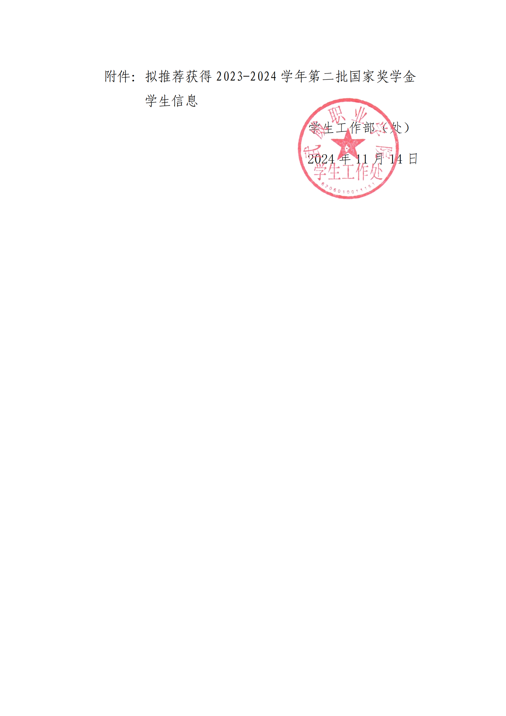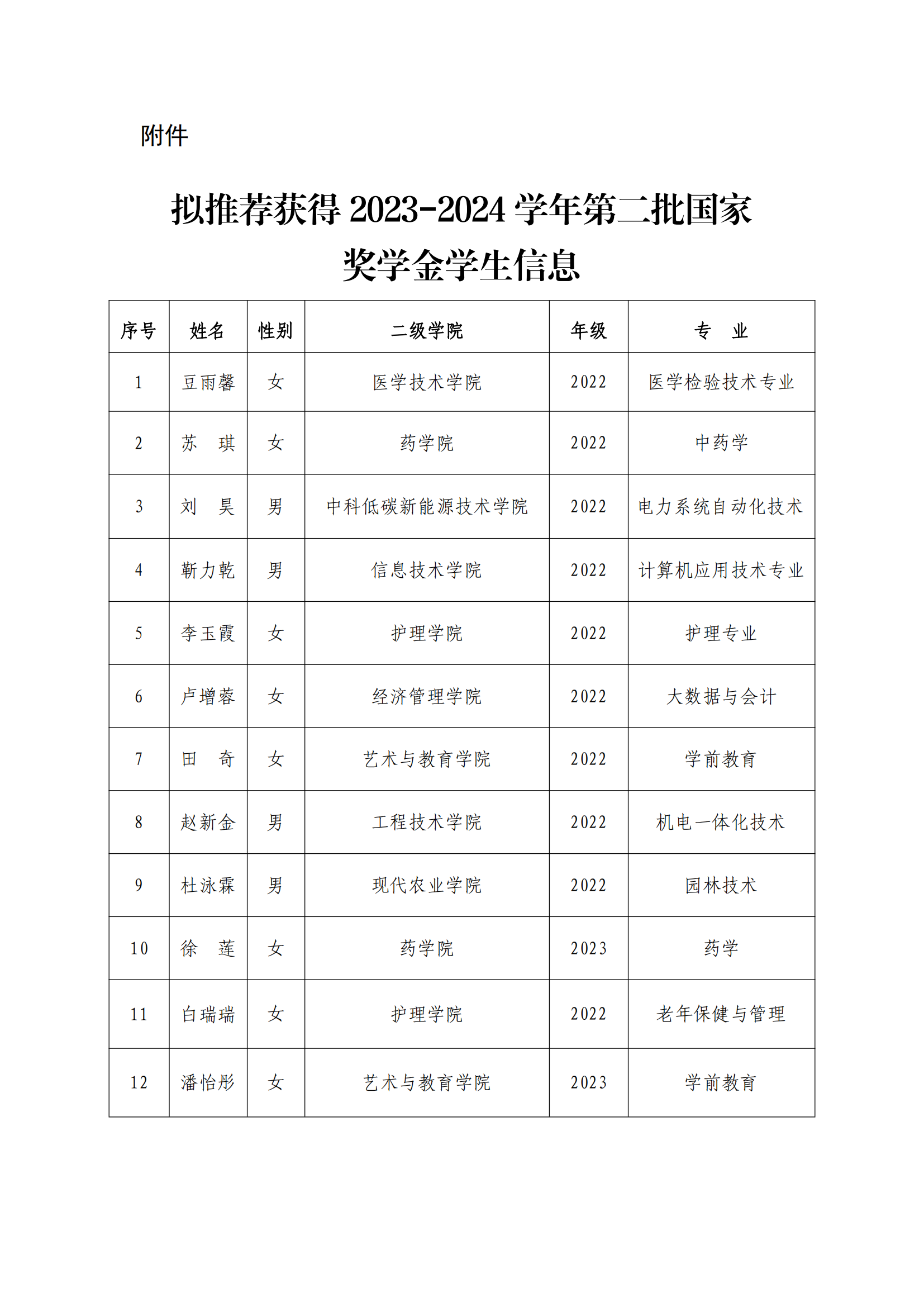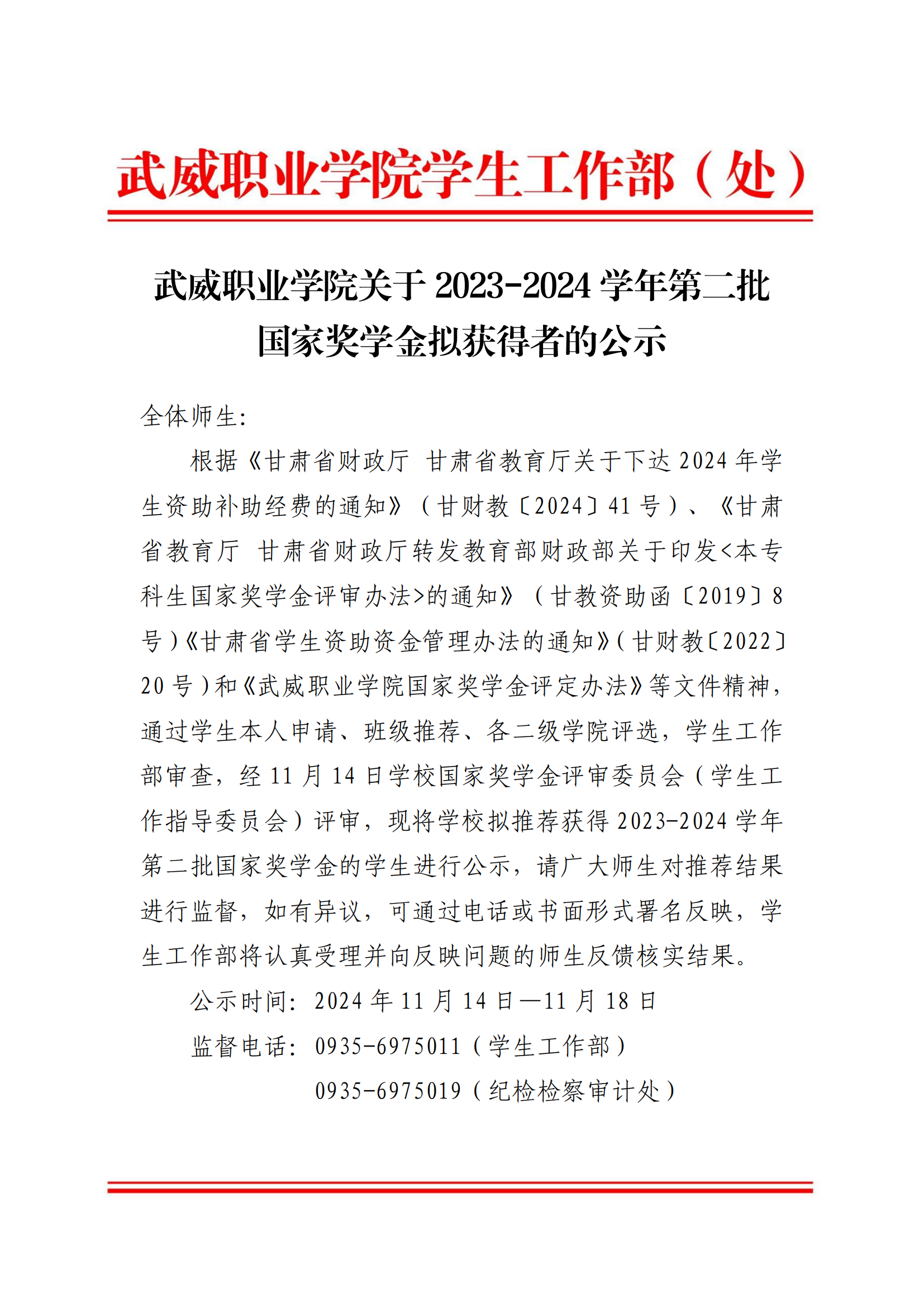 武威职业学院关于2023-2024学年第二批国家奖学金拟获得者的公示