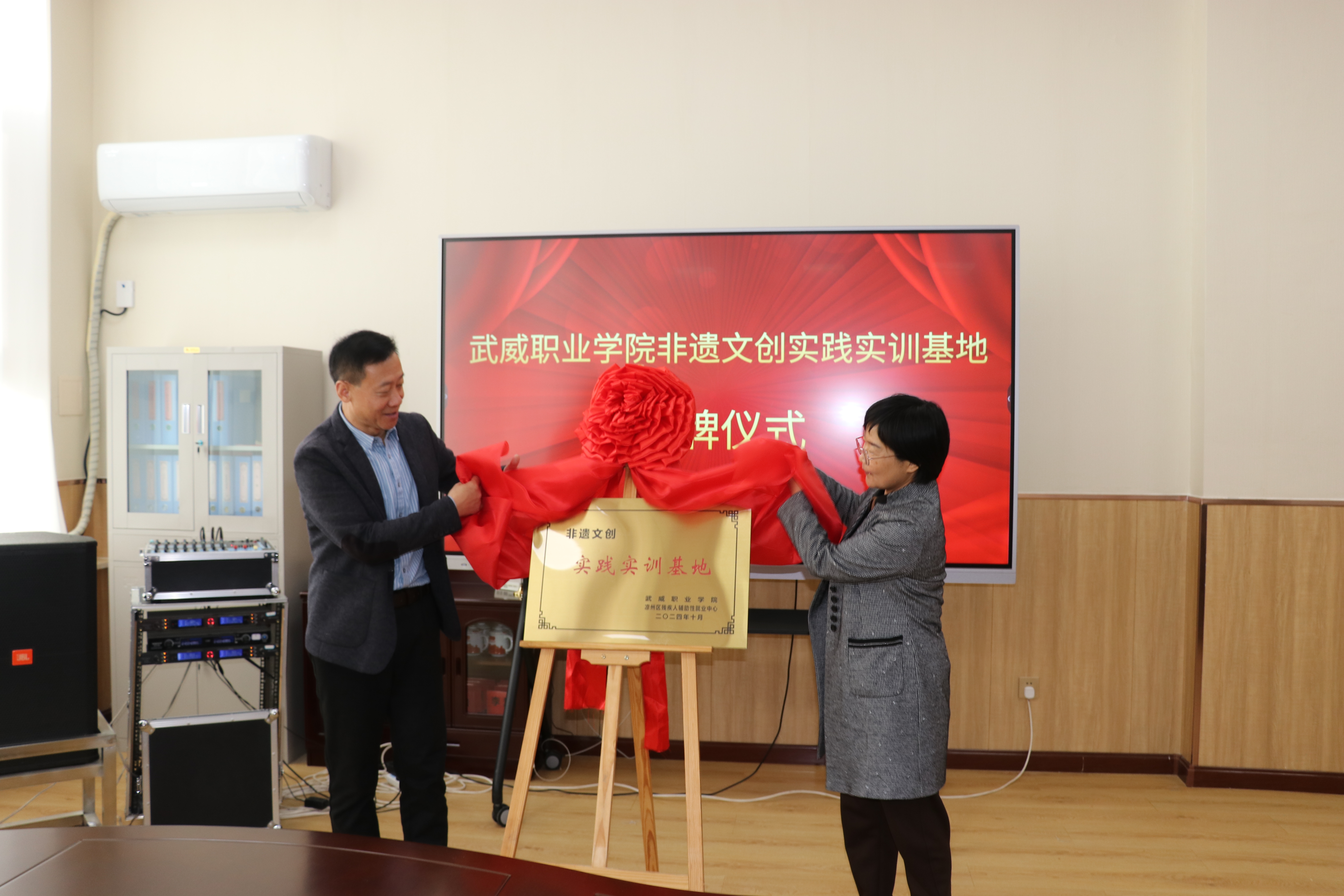 会上,武威市残疾人联合会副理事长柯长文,武威职业学院党委委员、副校长何毅为“非遗文创实训实践基地”揭牌。