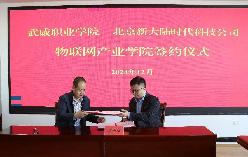 樊斌和翟存祥签署《武威职业学院 北京新大陆时代科技公司产教融合合作协议》。