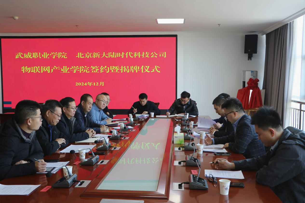 为全面深化产教融合,加强校企合作,进一步提高我校人才培养质量。12月3日,学校在能源科技楼811会议室举行武威职业学院和北京新大陆时代科技公司物联网产业学院签约暨揭牌仪式。北京新大陆时代科技公司西北区总监刘宁、技术总监樊斌,相关业务部门负责人,学校校长、党委副书记张开礼、党委副书记翟存祥、相关部门负责人及教师代表参加活动。党委委员、副校长王永绪主持仪式。