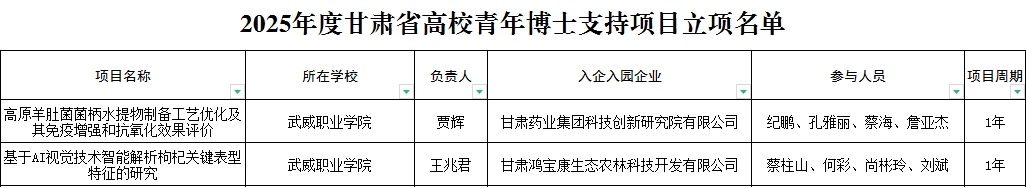 近日,甘肃省教育厅公布了2025年度甘肃省高校青年博士支持项目评审结果公示,我校贾辉博士主持的《高原羊肚菌菌柄水提物制备工艺优化及其免疫增强和抗氧化效果评价》和王兆君博士主持的《基于AI视觉技术智能解析枸杞关键表型特征的研究》2个研究项目成功获批。