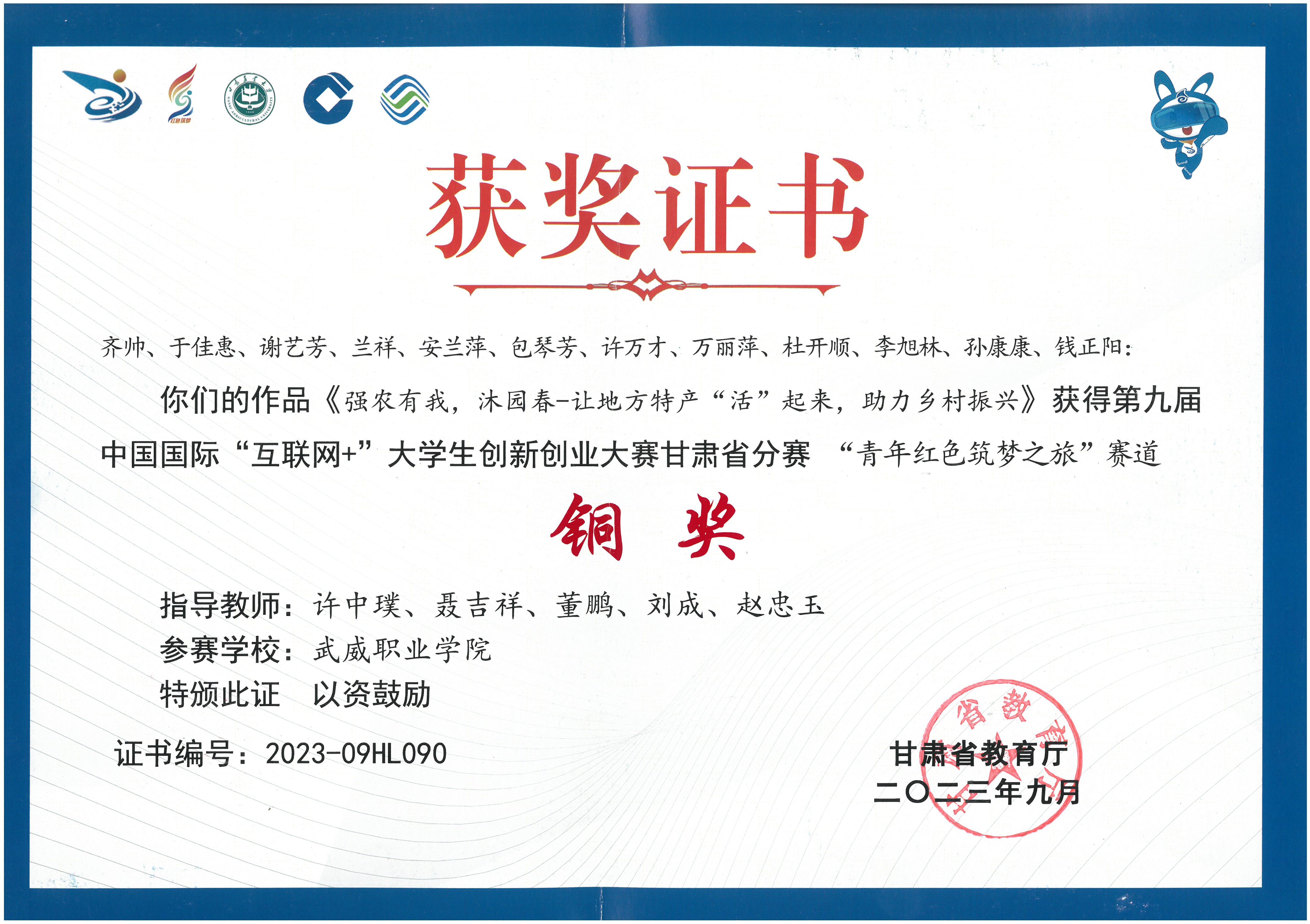 第九届中国国际“互联网+”大学生创新创业大赛甘肃省赛区铜奖