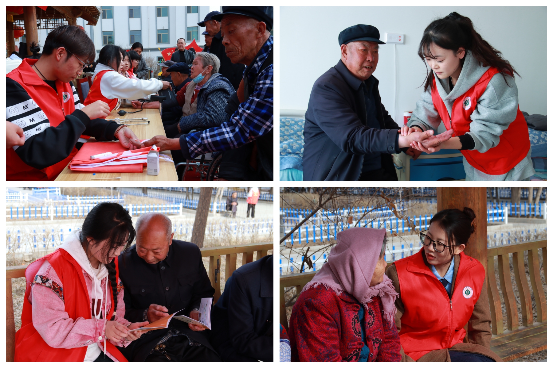 在健康慰问环节,护理学院志愿者结合专业特色,分组为老人测量血压、血糖,并耐心给老人讲解养生知识,告知在日常生活起居中的注意事项,以专业技能守护老人健康。