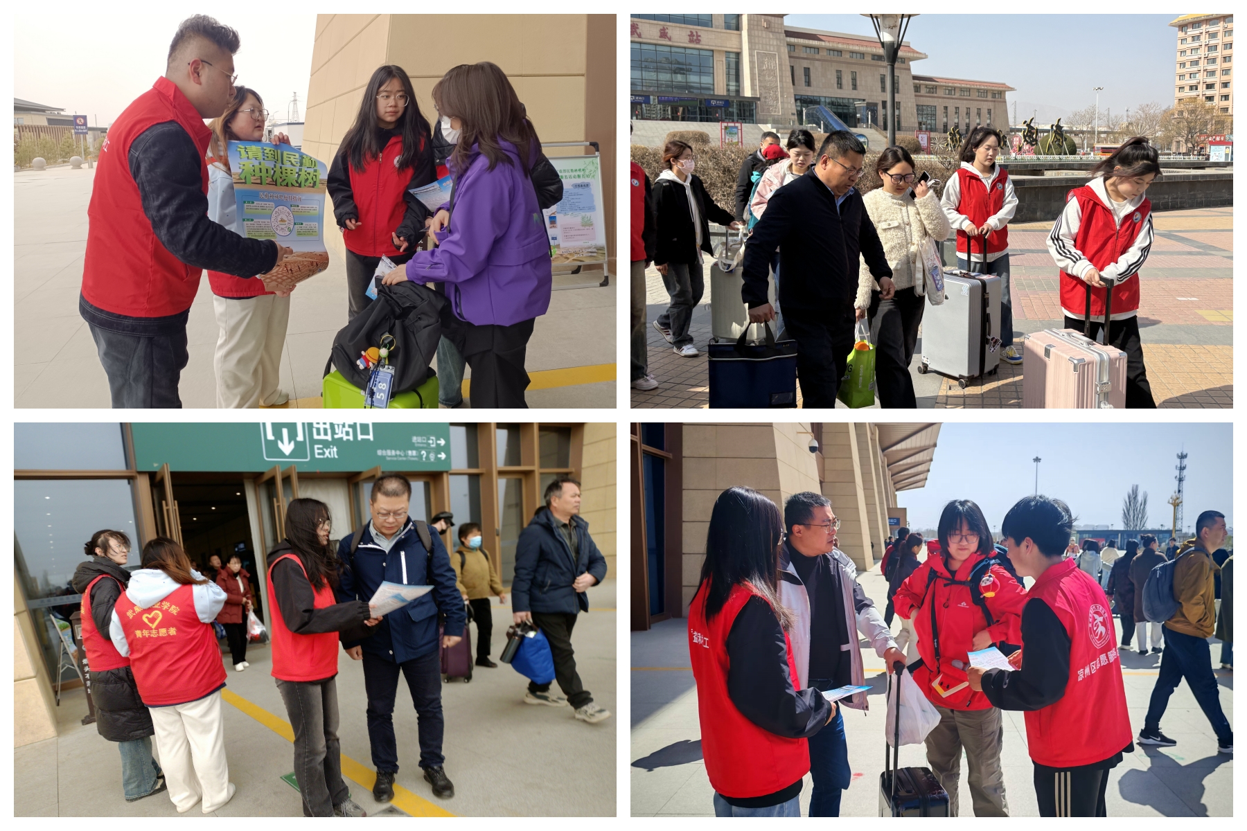 助力“请到民勤种棵树”活动。宣传统战部、校团委组织志愿者在武威高铁站、火车站、客运中心设立志愿服务站,为前来参加“请到民勤种棵树”活动的志愿者们提供引导服务,详细告知前往民勤的乘车路线、换乘信息和注意事项,协助搬运行李,引导他们有序乘车。