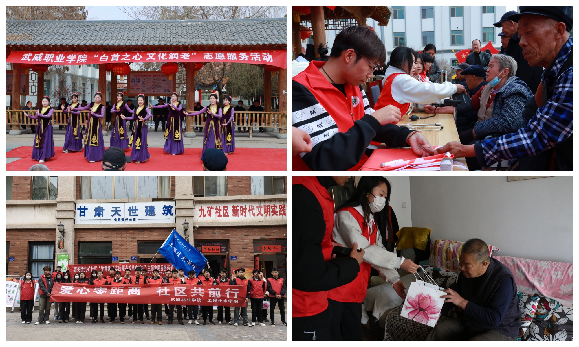 开展爱老敬老志愿服务活动。3月21日,校团委组织50余名护理和学前教育专业志愿者,前往凉州区中心敬老院开展“白首之心·文化润老”志愿服务活动,为老人捐赠生活用品和爱心物资,开展文艺表演慰问演出,为老人测量血压、血糖,告知在日常生活起居中的注意事项,以专业技能守护老人健康。3月5日,工程技术学院35名志愿者走进西关街九条岭矿区社区,开展“爱心零距离社区共前行”志愿服务活动,为社区孤寡老人、独居老人和老党员等特殊家庭送上慰问品,打扫卫生、擦拭家具,帮忙照料绿植,并与社区工作者一起规范摆放社区内乱停乱放的自行车、电动车,清洁窗户、地面,营造整洁有序的社区环境。