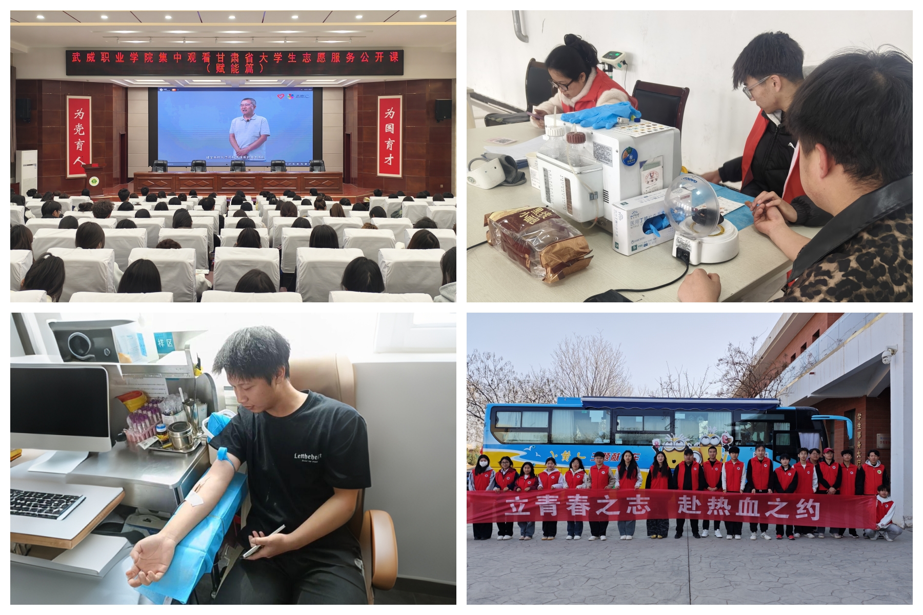 开展无偿献血活动。3月24日,校团委邀请市中心血站工作人员在学校开展“爱心无界 献血有爱”无偿献血知识讲座,220名有献血意向的同学聆听讲座。3月26日-28日,校团委联系市中心血站在学校开展“立青春之志 赴热血之约”无偿献血活动,100名志愿者累计捐献热血20700ml,为学校无偿献血事业做出突出贡献,为健康中国目标贡献青春力量。