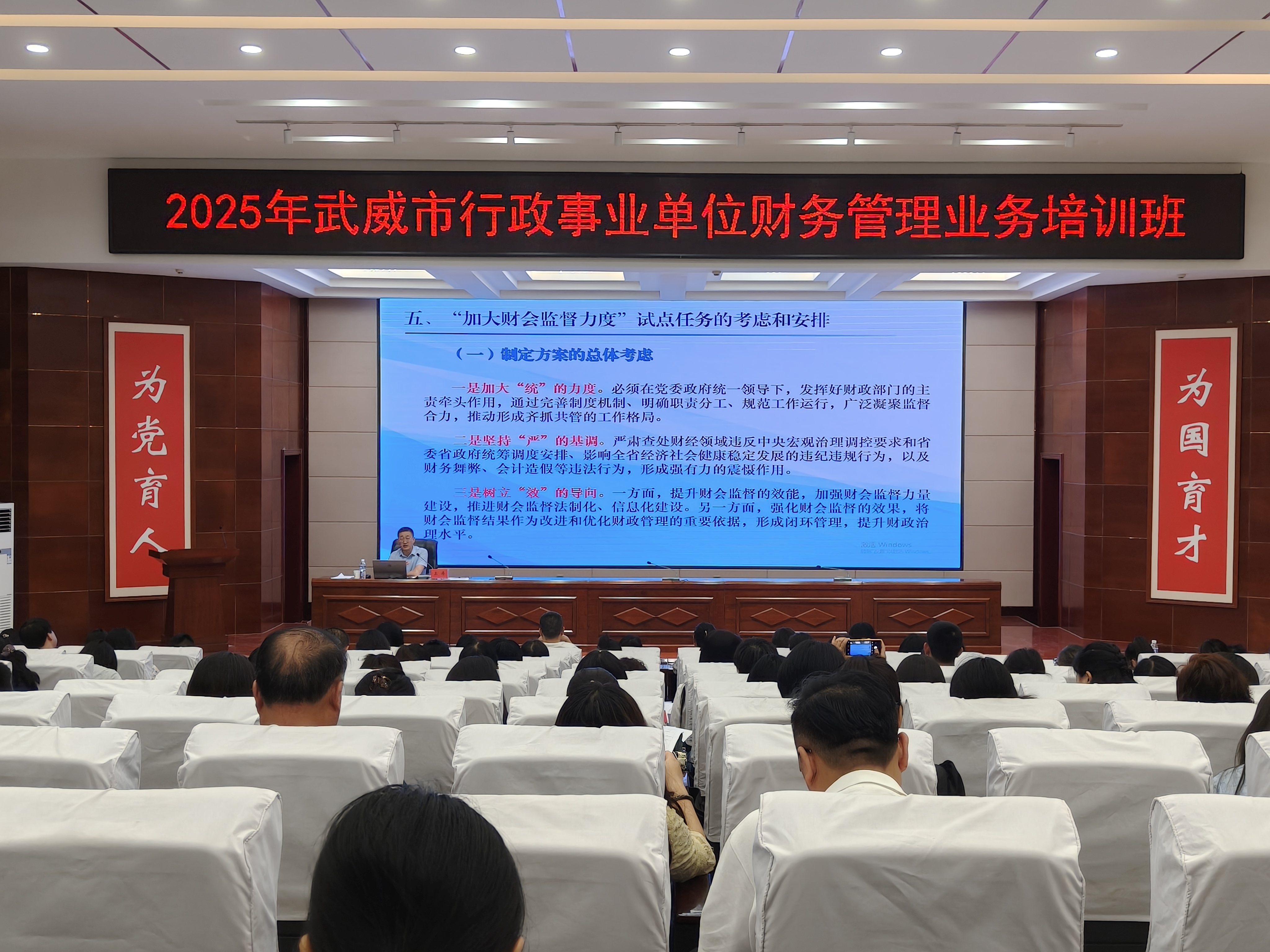 为深入贯彻实施新《会计法》,进一步做好2025年全市行政事业单位财会人员素质提升和岗位能力培训工作,根据市财政局局党组年初工作安排,6月11日-12日,由武威市财政局主办,学校承办的全市行政事业单位财务管理业务培训班在菁英厅顺利举行。全市行政事业单位财务业务骨干及业务人员共180余人参加了培训。